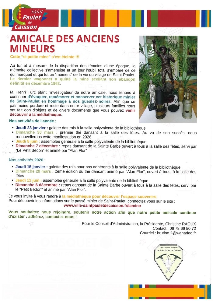 Cette amicale à la demande de plusieurs anciens mineurs, a pour but de réunir ses membres au moins deux fois l'an, une assemblée générale, plus la réunion de la fête de la Sainte Barbe.