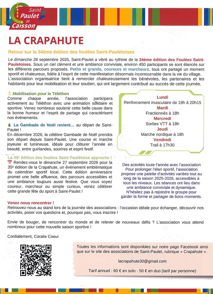 Pour la 34eme editon des foulées saint pauletoises, la crapahute propose un parcours de 7km,ouvert aux coureurs et aux marcheurs, ainsi que le célèbre parcours de 13,2 km qui emprunte les sentiers vallonées et ombragés de la valbonne. Les pré-inscriptions se font sur le site : www.run-evasionchrono.com ou sur place le jour de la course. Règlement 2025 à télécharger