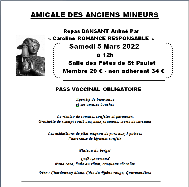 Cette amicale à la demande de plusieurs anciens mineurs, a pour but de réunir ses membres au moins deux fois l'an, une assemblée générale, plus la réunion de la fête de la Sainte Barbe.