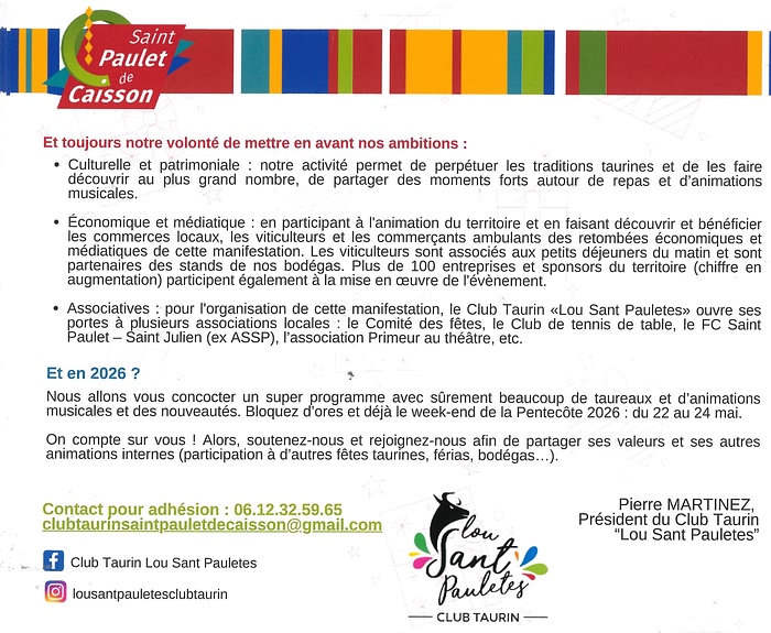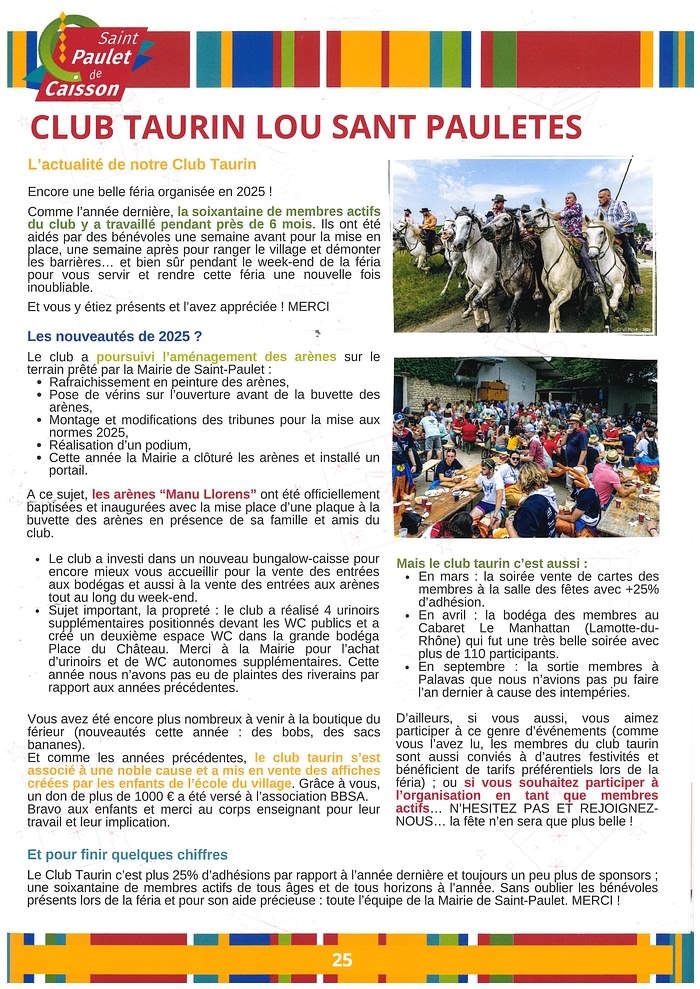 La culture taurine a toujours été très forte dans notre région, c'est en 1966, sous la présidence de Marcel Beissier Maire de Saint Paulet de Caisson, que le premier club taurin fut créé, il a fonctionné pendant 16 ans à travers diverses manifestations puis dissout en 1982 avec encore 86 membres actifs. Pourquoi la renaissance d'un Club Taurin ? Durant une dizaine d'années, le village de Saint Paulet de Caisson a organisé des manifestations taurines pendant la fête votive. L'engouement des spectateurs et des participants, de plus en plus nombreux, nous a incité à la création de cette association pour dynamiser et pérenniser les traditions taurines dans la partie septentrionale de notre région. Aujourd'hui notre association compte plus de 200 membres et vu le succès rencontré, son nombre d'adhérents est en constante augmentation. Article du Petit Saint Paulétois 2026 : ![]() ![]() |